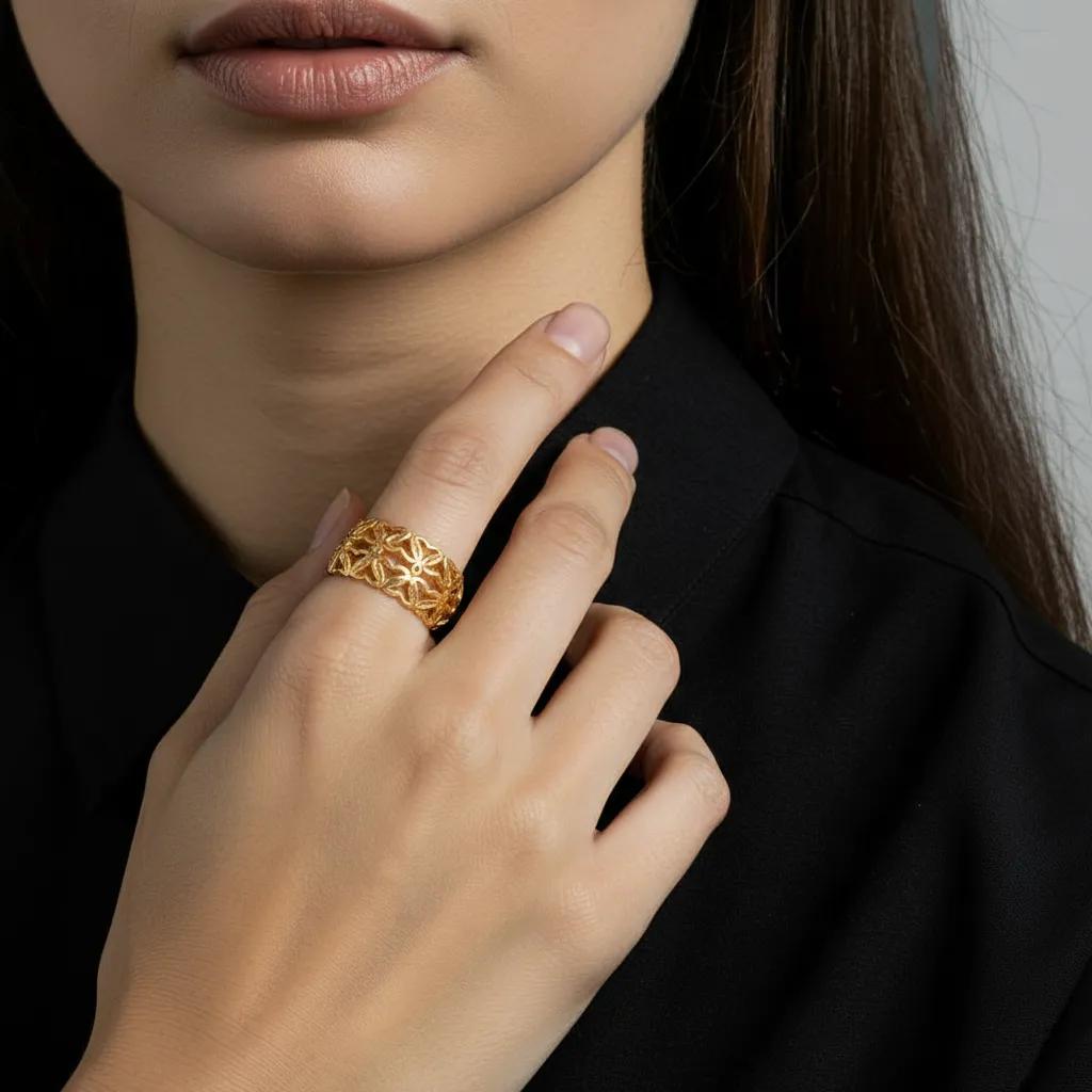 Tragen Sie diese lebhafte Kreation: den Ring Blossom Gold. Dieses feine Schmuckstück aus vergoldetem Metall ist für jeden Anlass geeignet, dank seines detaillierten Blumenmusters, das Licht und Aufmerksamkeit einfängt.