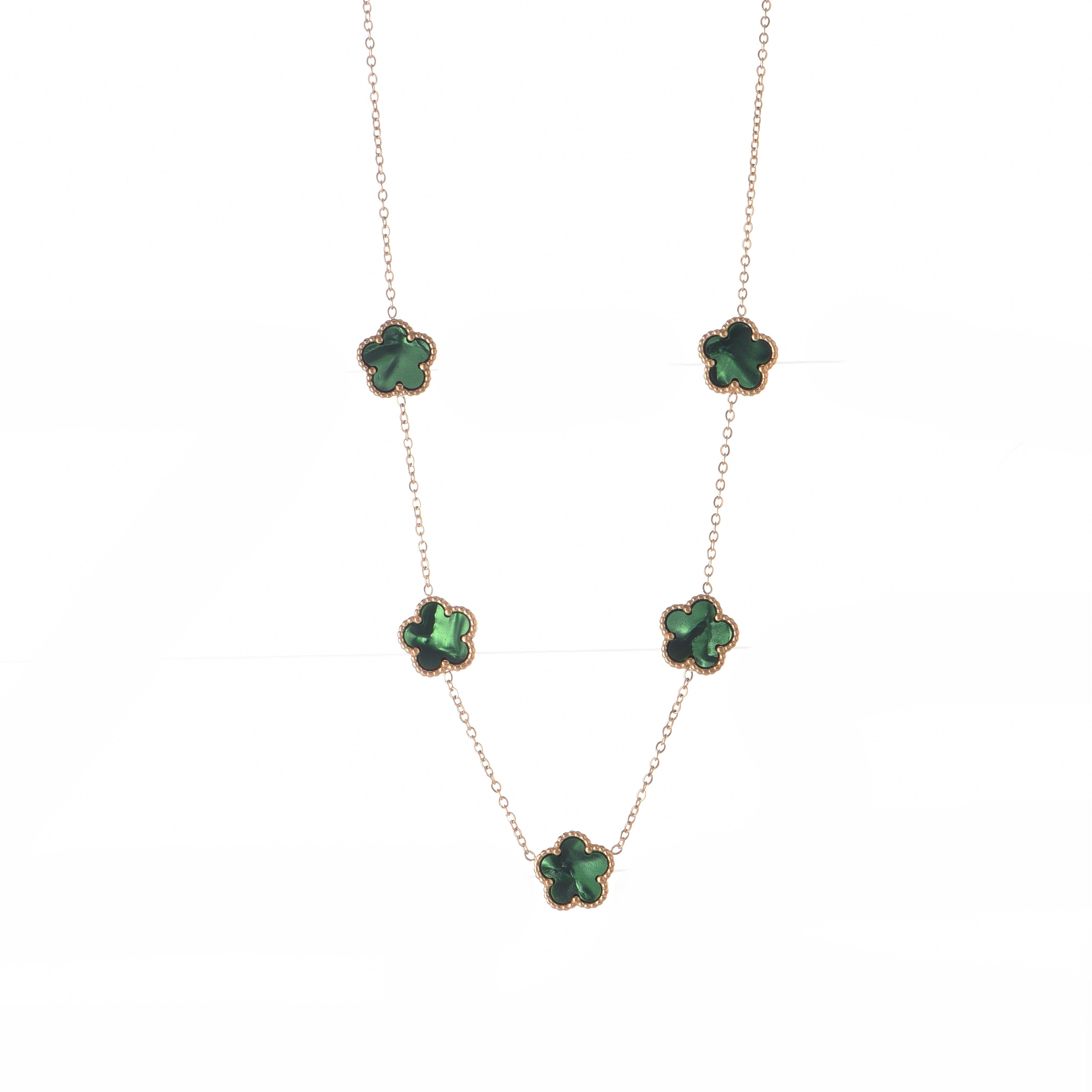 Discover the timeless beauty of the Green Gold Four-Leaf Clover Necklace, a refined jewel perfect for every occasion. Made of golden metal, this minimalist necklace features five pendants shaped like green four-leaf clovers that add a touch of grace and luck to your appearance. The adjustable length from 40 to 44 cm ensures a perfect fit for every woman.