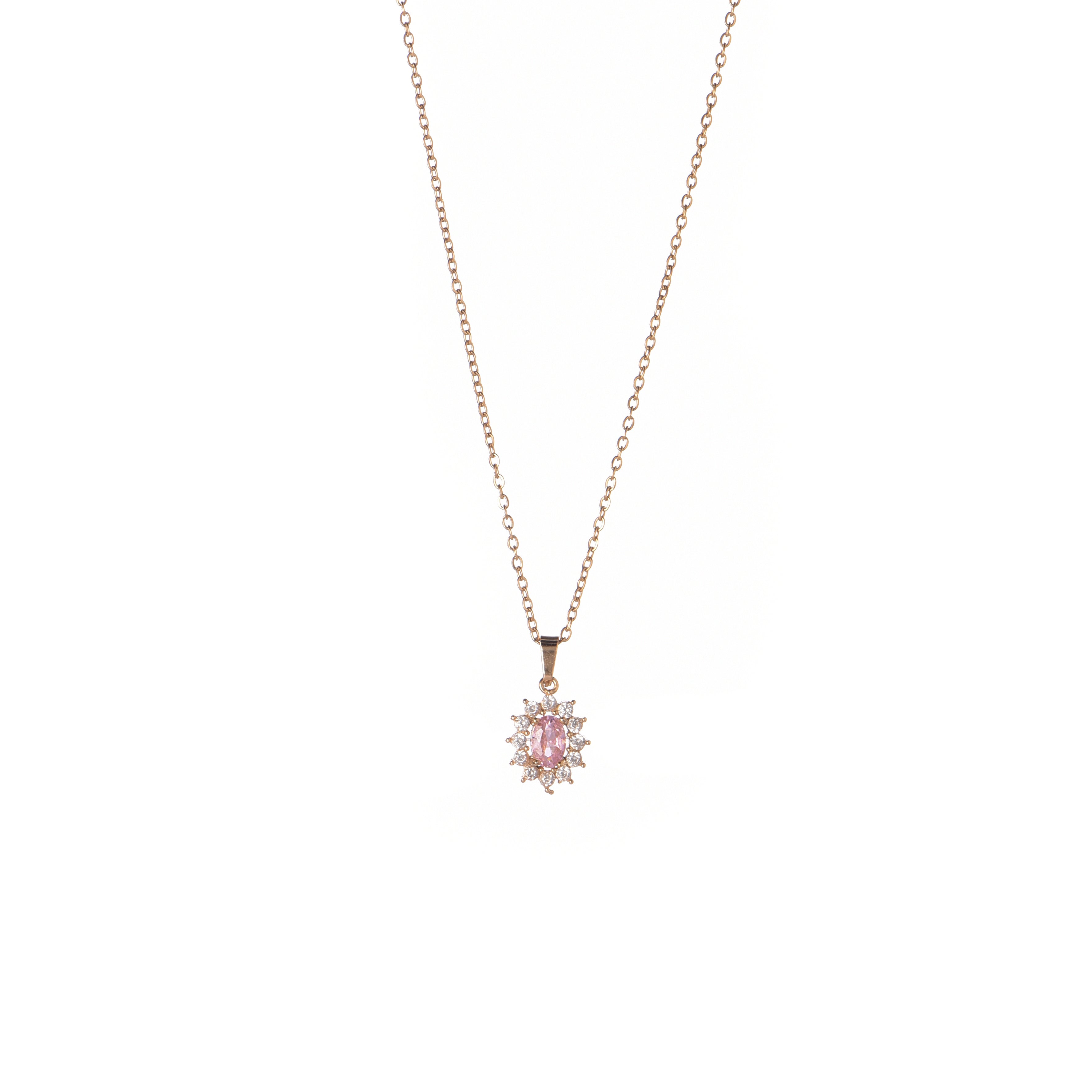 La elegancia romántica y el brillo majestuoso se funden en esta refinada joya. Con un cristal central en delicados tonos rosados, este collar está diseñado para quienes buscan un accesorio que combine un color suave con un estilo sofisticado, perfecto para iluminar el escote con un toque de clase atemporal.