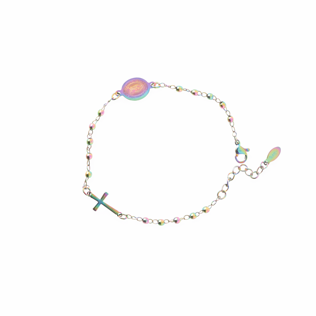 La pulsera Alina es un reflejo puro de estilo y originalidad, diseñada para quienes aman destacar con elegancia. Elaborada en acero con un fascinante acabado holográfico, este modelo juega con reflejos iridiscentes que cambian con cada movimiento. Su diseño único alterna una cadena de bolas, una cruz minimalista y un medallón central iridiscente, creando un elemento moderno y distintivo.