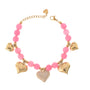 La pulsera Sweet Rose añade un toque romántico a tu look. Elaborada en metal dorado, esta pulsera cuenta con encantadoras cuentas rosas y cinco charms en forma de corazón, uno de ellos adornado con brillantes cristales. Con una longitud ajustable de 17 a 20 cm, se adapta perfectamente a cualquier muñeca.