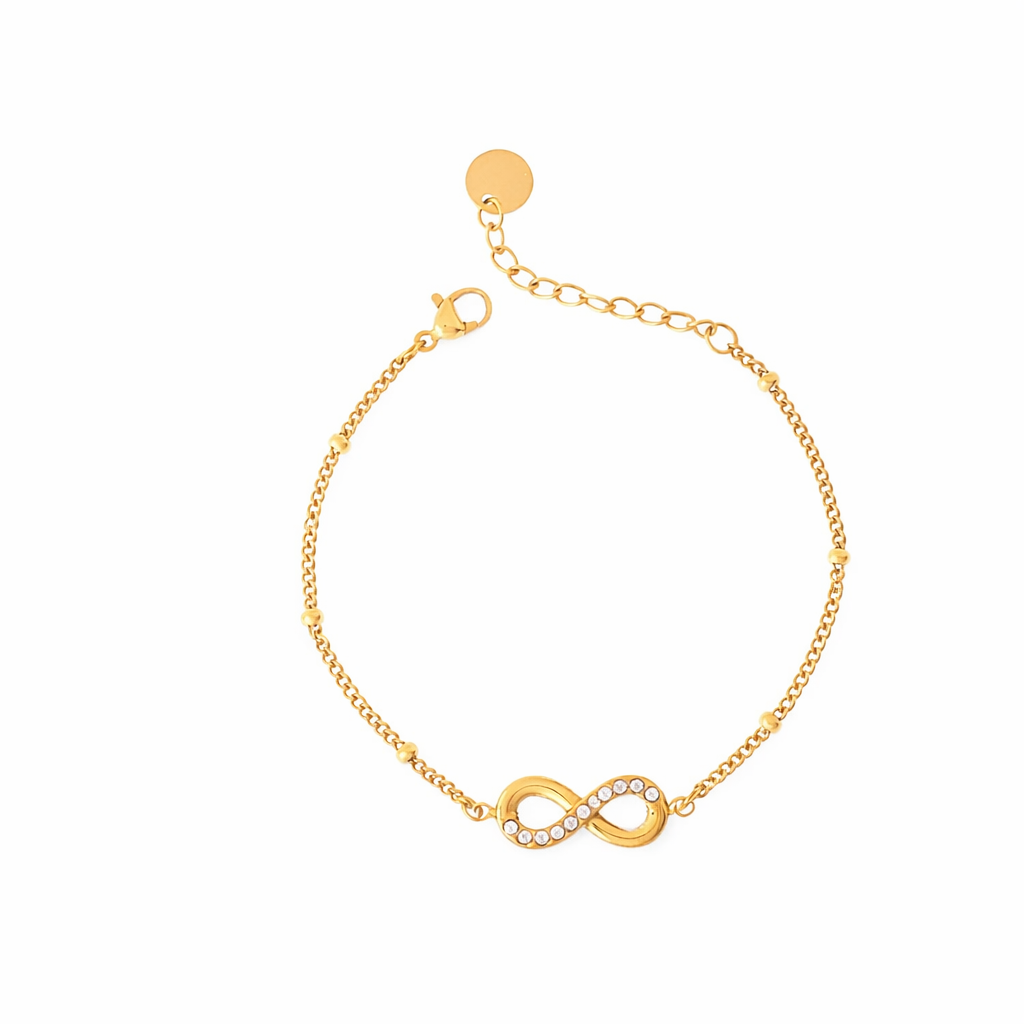 La pulsera Oria celebra la continuidad y la elegancia infinita. Con una fina cadena de eslabones alternados, luce un luminoso símbolo de infinito en el centro, adornado con un brillante pavé de diamantes de imitación. Una joya con un diseño fluido y refinado, perfecta para quienes buscan un accesorio significativo que ilumine la muñeca con discreción y estilo.