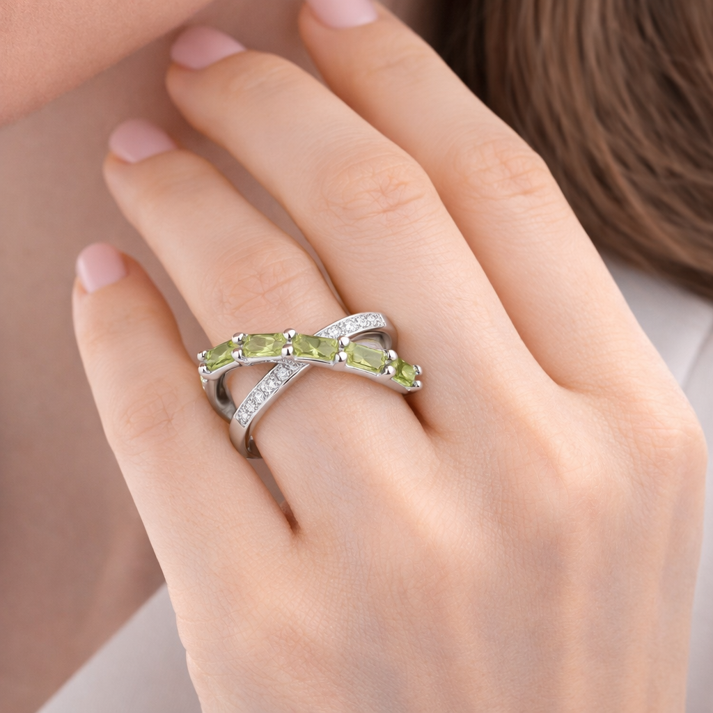 L'Anello Manila Verde si distingue per il suo design a incrocio dalle linee fluenti, dove l'eleganza di punti luce bianchi incontra la lucentezza raffinata di pietre verdi taglio baguette. Un gioiello unico pensato per chi desidera un accessorio luminoso che richiami i colori della natura con estrema classe.