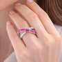 L'Anello Manila Rosa si distingue per il suo design a incrocio dalle linee fluenti, dove l'eleganza di punti luce bianchi incontra l'intensità di pietre fucsia taglio baguette. Un gioiello contemporaneo pensato per chi non ha paura di osare e vuole aggiungere un tocco pop e vibrante al proprio look.