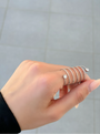 L'Anello Twist rompe gli schemi tradizionali con una struttura multi-giro che risale il dito con eleganza. La sottile fascia lavorata è impreziosita alle estremità da due luminose pietre bianche, creando un gioco di punti luce sospesi. Un accessorio di bigiotteria dal design leggero ma di grande presenza scenica.