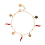 Scopri il fascino del Bracciale Protect Gold, un gioiello raffinato e minimalista in metallo dorato. Con una lunghezza regolabile da 18 a 21 cm, questo bracciale si adatta perfettamente al tuo polso. I ciondoli portafortuna, tra cui quadrifogli e cornetti rossi, aggiungono un tocco di eleganza e simbolismo. Perfetto per ogni occasione, questo bracciale è un must-have per ogni collezione di gioielli femminili.