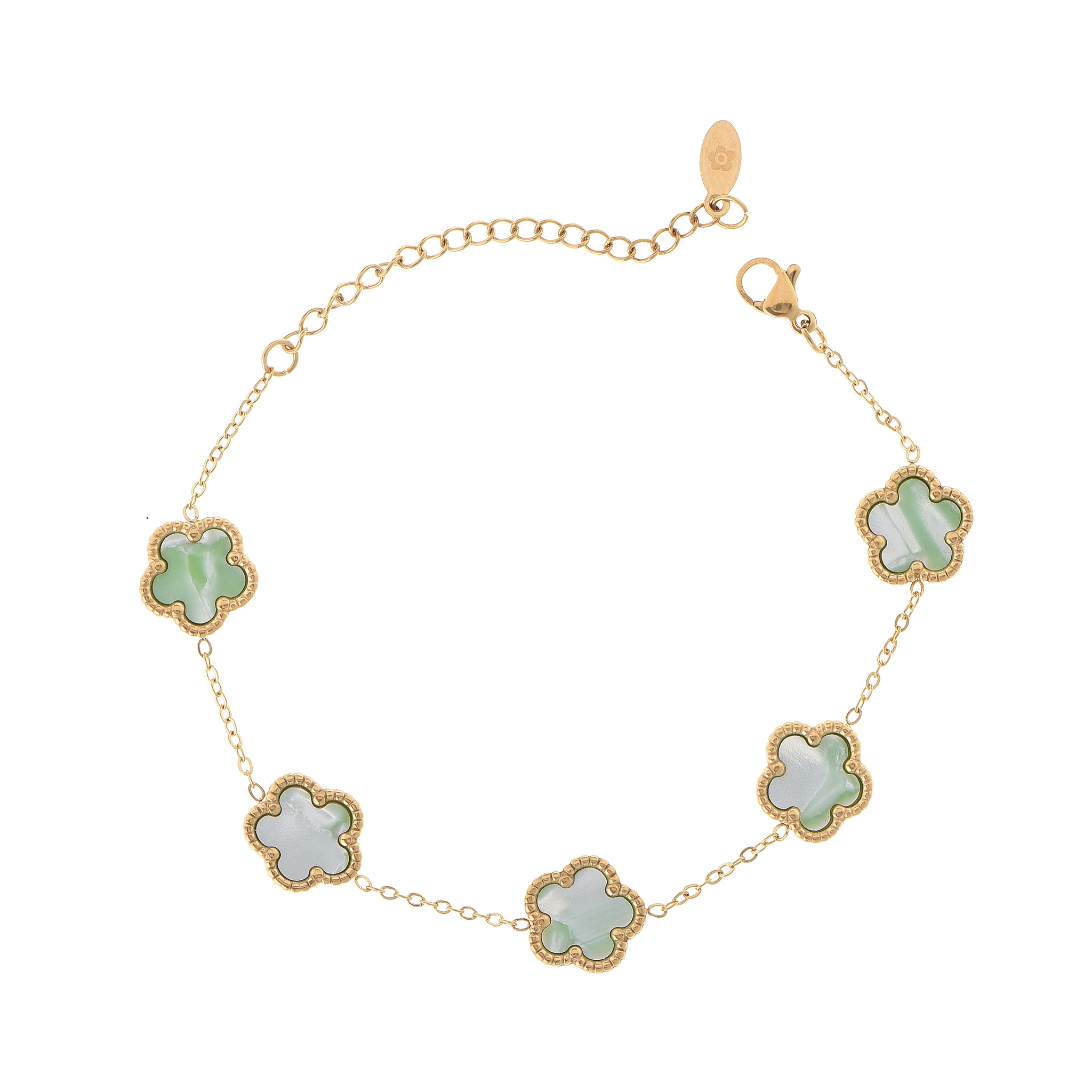 - Design: Struttura a catena sottile con motivi a quadrifoglio in tonalità aqua e oro.