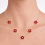 Scopri la bellezza senza tempo della Collana Quadrifoglio Red Gold. Realizzata in metallo dorato, questa collana minimalista presenta cinque eleganti quadrifogli rossi, perfetti per aggiungere un tocco di colore e raffinatezza al tuo look quotidiano. Con una lunghezza regolabile da 40 a 44 cm, si adatta perfettamente a qualsiasi scollatura.